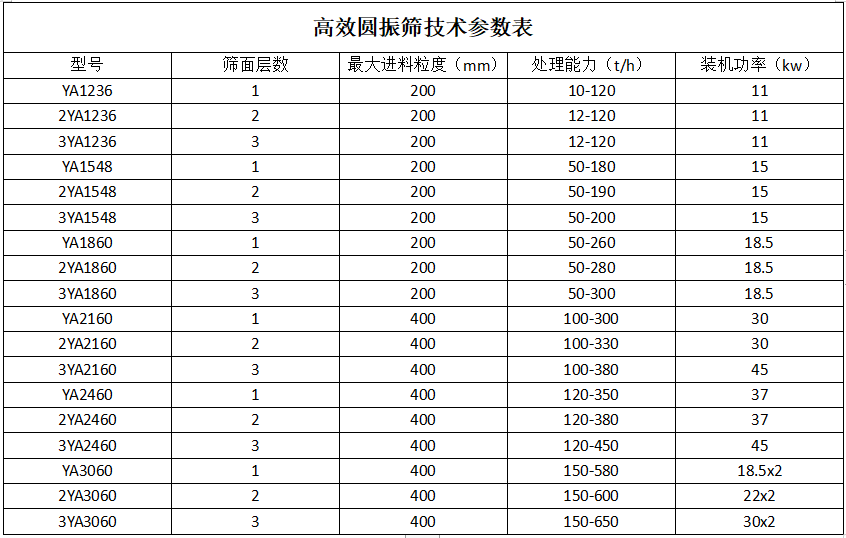 YA型圆振动筛采用了国际先进的环槽铆钉、偏心轴加偏心块式振动器、低应力减震弹簧和超重型大游隙轴承及稀油润滑等先进工艺和技术,具有筛框结构强度高、机械结构合理、大游隙轴承运转温度低、运行噪声小、使用寿命长等优点