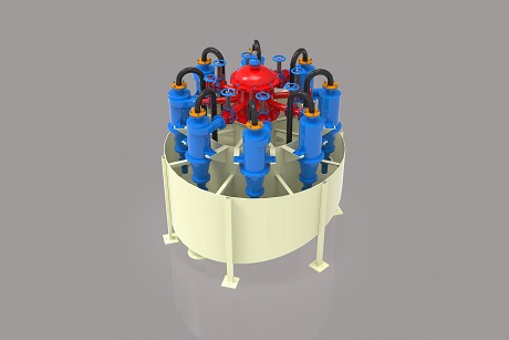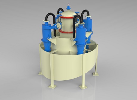 旋流器组与其他设备组合成分级设备组,可提高磨机的处理能力15%以上,组合设备之一的多功能筛可将溢流中的粗颗粒自动返回磨机。