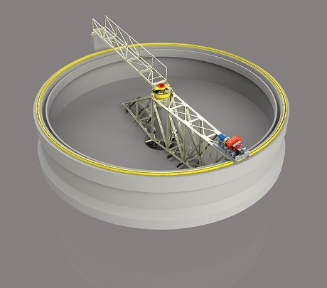 浓缩池是由钢筋混凝土或者纯钢壳体制成,其中心有一个钢筋混凝土的支柱或钢支柱,动梁的一端和集电装置置于浓缩池的中心支柱上。传动机构装置在动梁的另一端,传动机构由电机、联轴器、减速机、齿轮、齿条等组成。电源接入中心支柱上的集电装置,再由敷设在耙架上的电缆将电流引入电动机,通过传动机构的运动,带动动梁旋转,装在动梁上的刮板刮集沉淀物,由基础下部导管输出浓缩物。